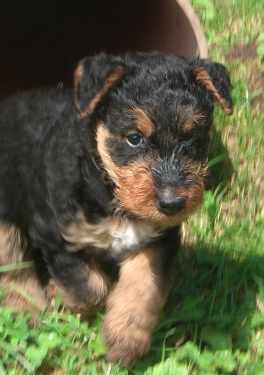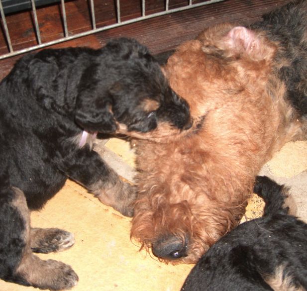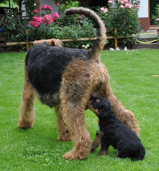 04.08. - 07.08.2014: Die Welpen werden immer entdeckungslustiger. Sie erobern sich immer neue Bereiche. Sie spielen und balgen sich. Außerdem probieren sie ihre wachsenden Zähnchen überall aus. Das zwickt schon ganz schön.