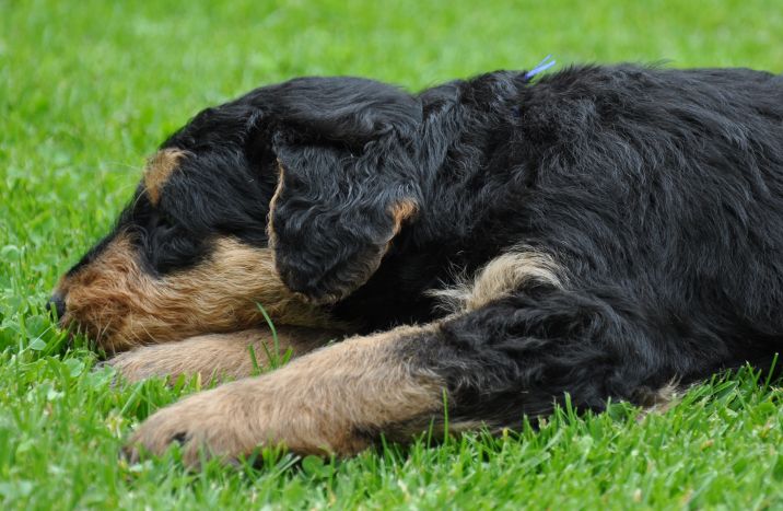 10.08.2014: Nachdem sich alle Welpen die Terasse erobert haben, gibt es ein neues Erlebnis. Der erste Besuch des Gartens. "Auf der grünen Wiese...."